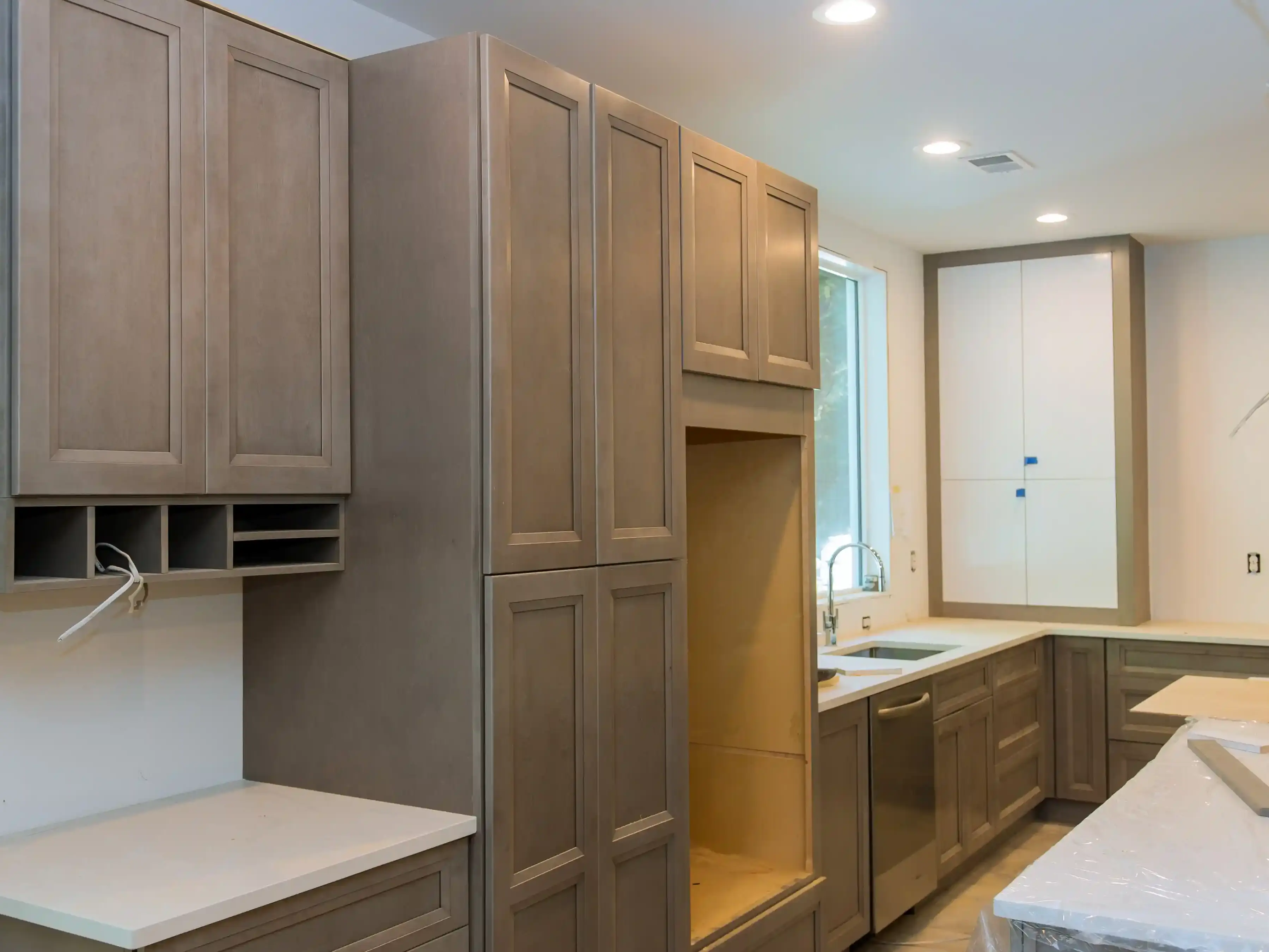 We measure, check service routes, and assess walls, floors, and ceilings for necessary preparation. Before new units arrive, old kitchens are removed and rooms prepared.